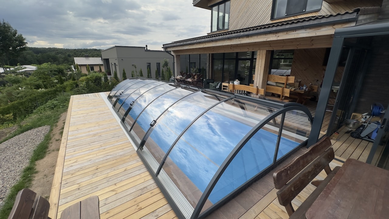 Baseino uždengimas Vilniuje paverčia įleidžiamą baseiną terasoje komforto zona ištisus metus