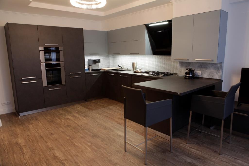 Отмечу, что поскольку это кухня-гостиная, то в зоне полуострова столешница специально сделана с небольшим нависанием. Семья может удобно разместиться на барных стульях за таким столом-барной стойкой, чтобы перекусить. Не говоря уже о домашних вечеринках  – гости будут уютно ощущать себя на барных стульях из высококачественной кожи и стали, созданных с учетом максимум комфорта для человеческого тела. Мы работаем с несколькими немецкими фабриками по производству столов, стульев и мягкой мебели, Вы обязательно найдете у нас мебель по душе из высококачественных материалов в ассортименте.