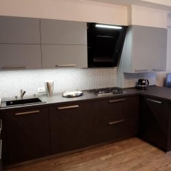 Эта кухня выполнена в ламинате Alnodur, с фактурой сланца. Специалисты салона Санилюкс предложили в качестве компаньона  к темным пеналам и тумбам “под камень” – навесные шкафы из сатинированного стекла с бархатистым эффектом. Остановились на цвете –  синяя патина, получилось прохладное морское сочетание.