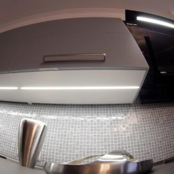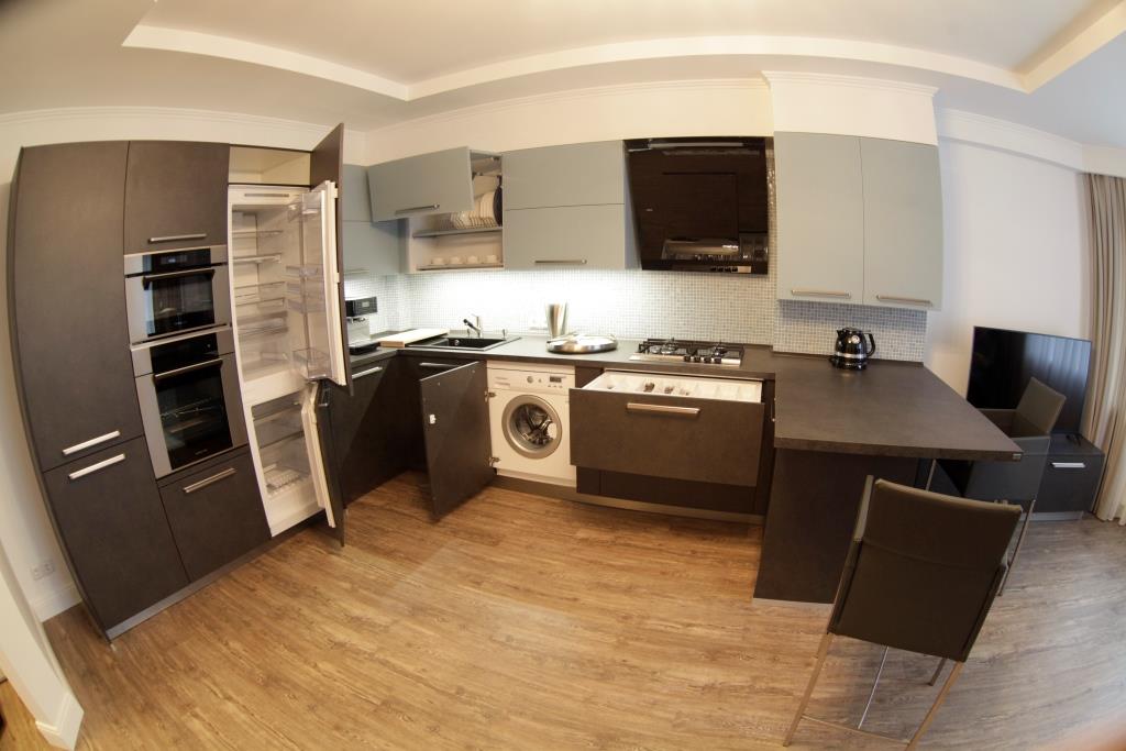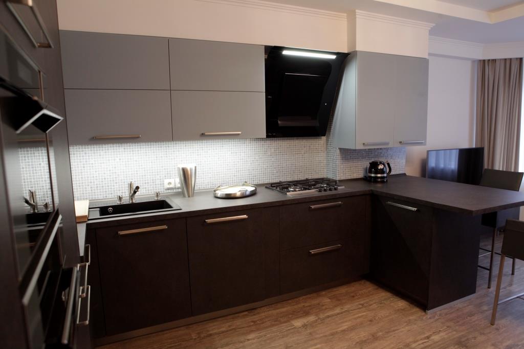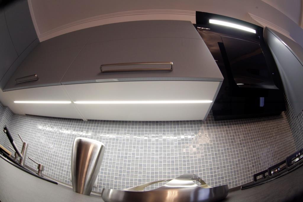 Несколько слов о технических причудах этой кухни: напольный шкаф под варочную поверхность имеет 2 выкатных ящика, причем 1 скрытый с лотком для столовых приборов.  Для удобства использования  имеется специальная защелка, при необходимости доступа к более глубокому ящику,  ее легко можно отщелкнуть.  Слева от варочной поверхности – выкатная бутылочница с хромированными корзинами, где хозяйка может расположить масло, соусы и прочее, открывается она простым нажатием на фасад. Для удобства использования все навесные шкафы сделаны со складными дверцами с амортизацией открывания и закрывания). Тонкой молнией прорезает дно навесных шкафов светодиодная подсветка, просто и очень стильно.