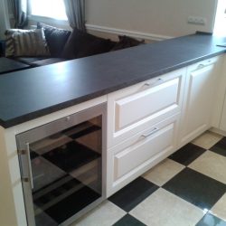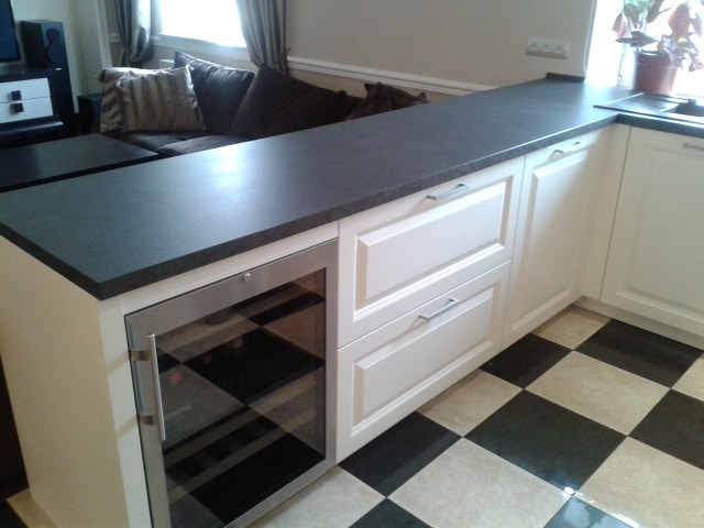 Столешница и настенная панель из немецкого ламината цвета «серая лава» выгодно оттеняют светлые фасады немецкой кухни Ballerina.