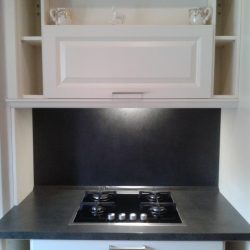 Дополнительным элементом украшения кухни Ballerina служит классический карниз, открытые полки, обрамляющие зону варочной поверхности и встроенной вытяжки, и 5см боковые панели, акцентирующие различные элементы кухни (конструкцию из пеналов, линию напольных шкафов).