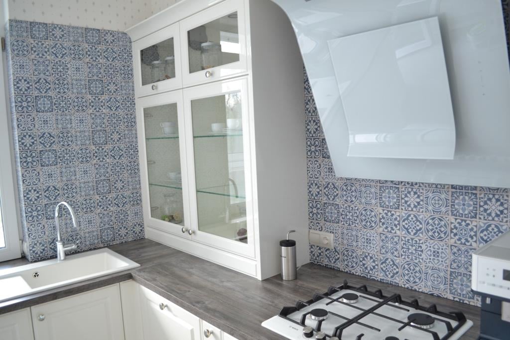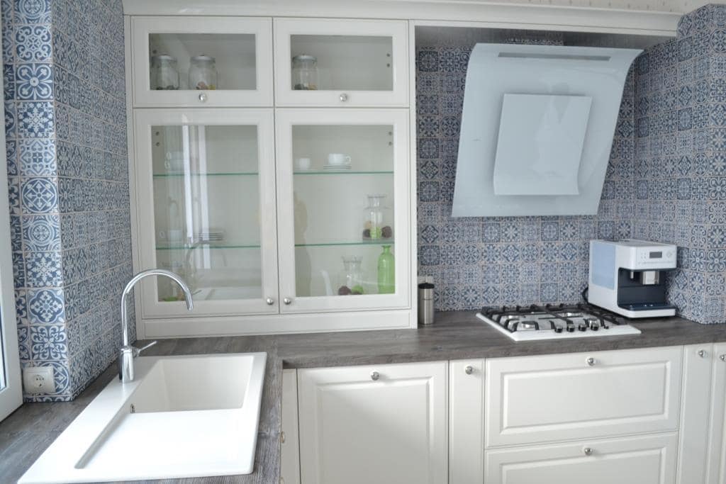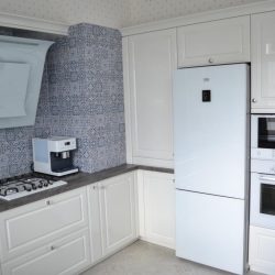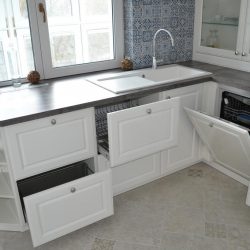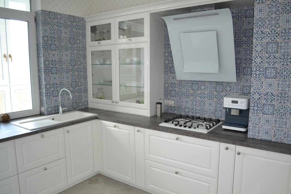 При создании гарнитура для этой кухни пришлось учесть многие моменты – встроить всю купленную заранее технику, перенести подвод воды к кухонной мойке, задействовать место под окном, не смотря на наличие батареи.
