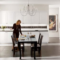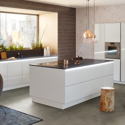 Лакированные фасады немецкой кухни Ballerina разделяются на четыре подвида: микроструктурный лак, бархатистый лак, высокий глянцевый лак и матовый лак. Лаки всегда выглядят очень благородно и изысканно, их можно чистить обычным моющим средством.Плюсом лака является возможность его реставрации.