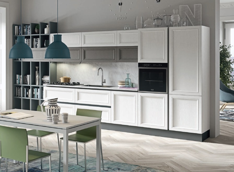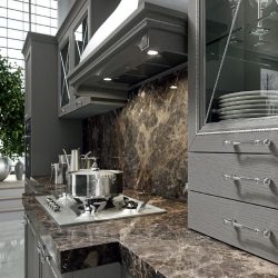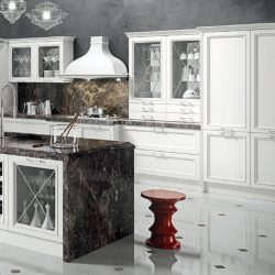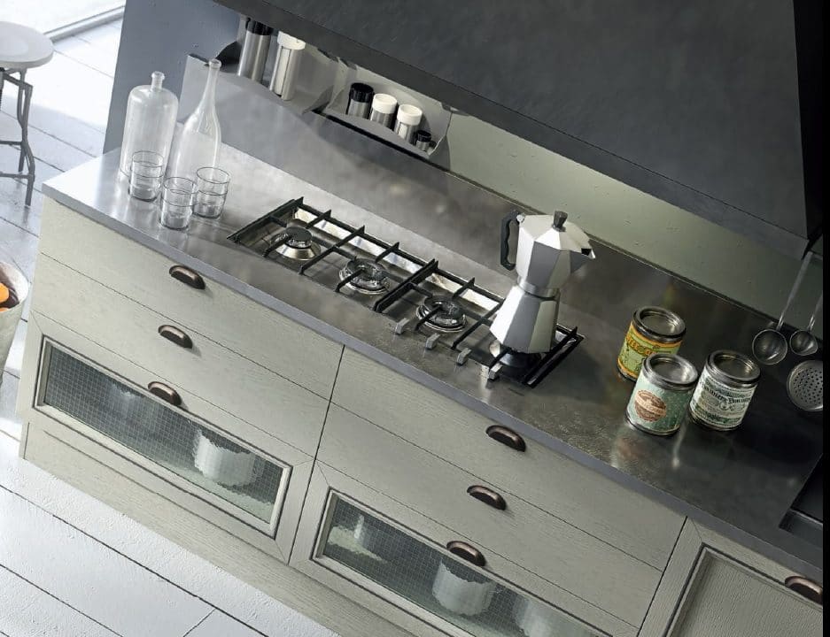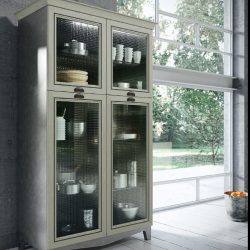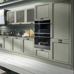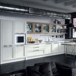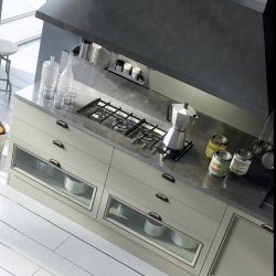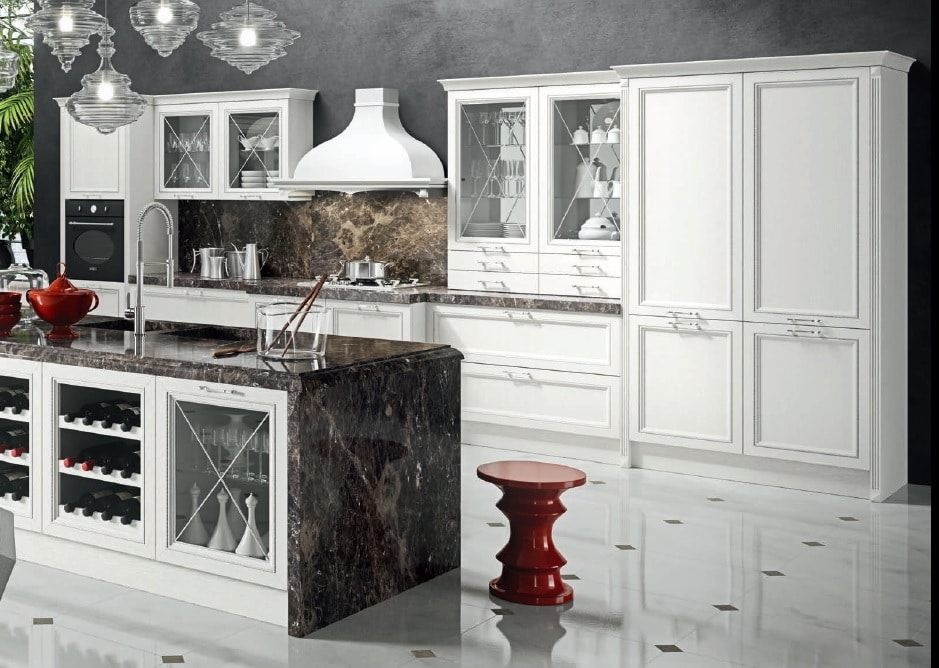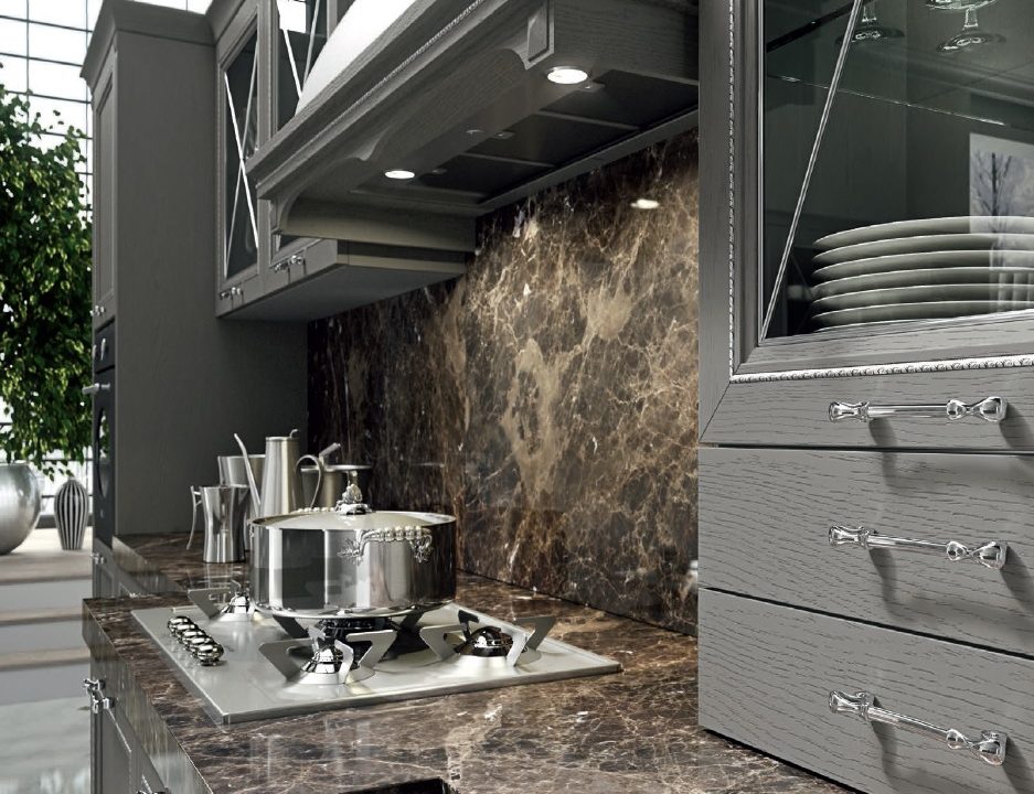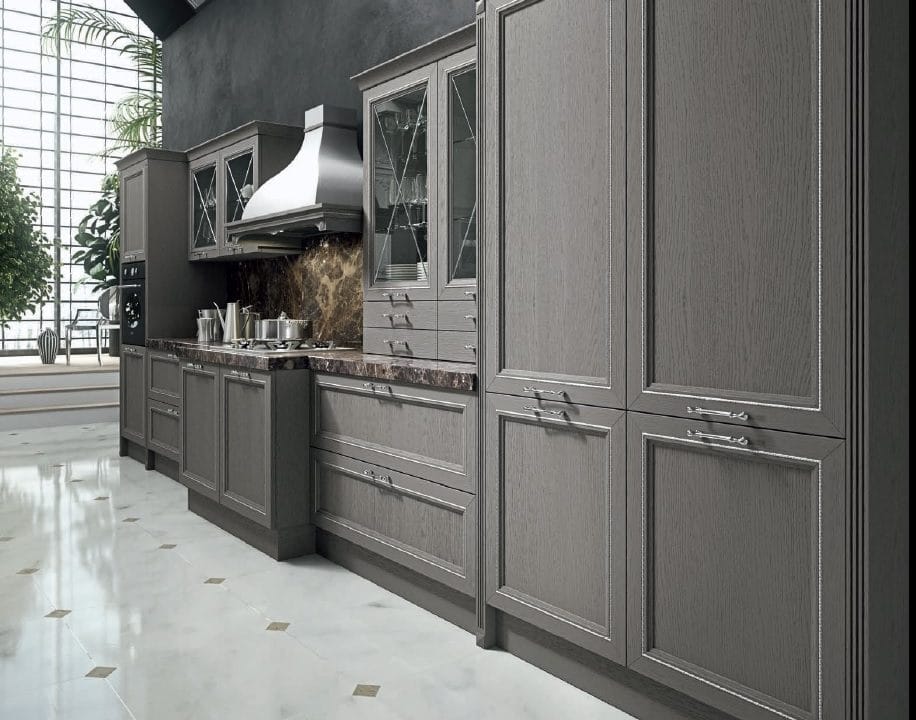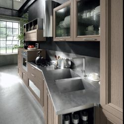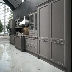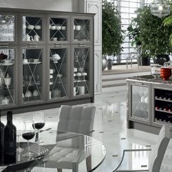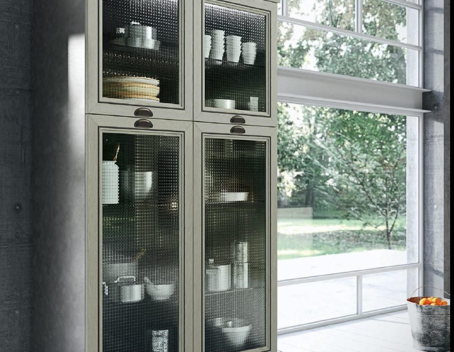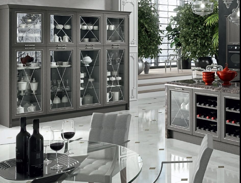 Современный городской стиль кухни Aran Cucine Magistra, с эффектом небольшого старения, практичная в использовании кухня, стальная панель, карниз декорированный серебром или золотом. Фасады кухни Aran Cucine Magistra из лакированного декапированного ясеня с армированным стеклом. Аксессуары с эффектом железа и промышленного стекла.